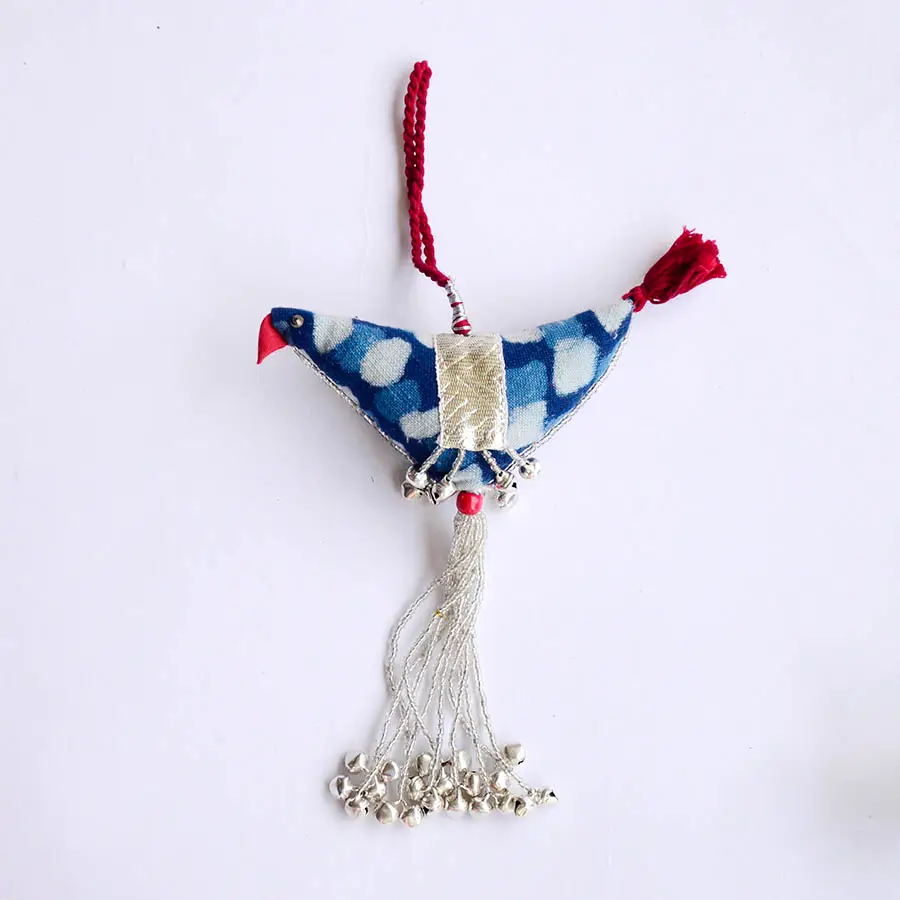 In our attempt towards zero waste, we are working with women that are part of an NGO. This beautiful fabric bird is made by those women. It is made from our organic cotton fabric leftovers from table runners and napkins. The beads and the jingle add to the beauty of this. In this one purchase, you'll be supporting the organic cotton farmers, block printers, and the women who made these into these beautiful ornament. It's also great for the planet!
