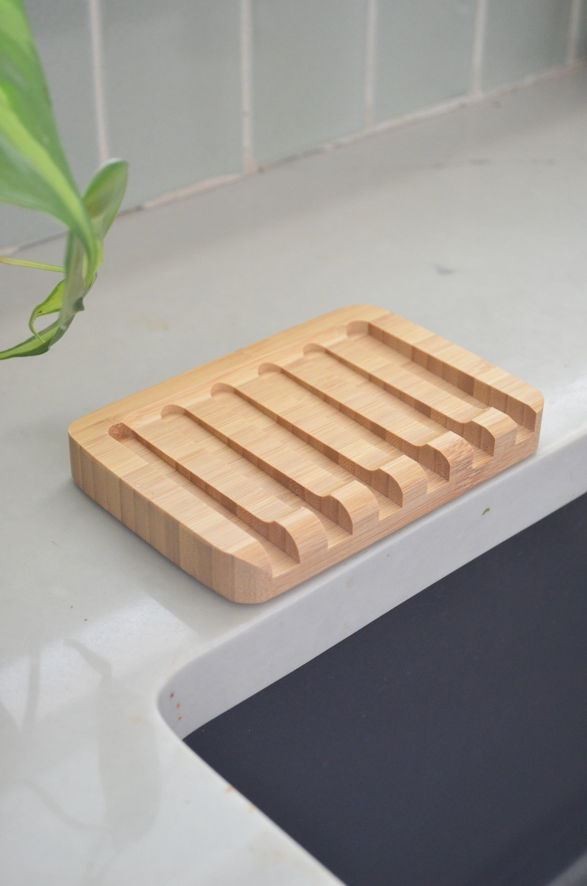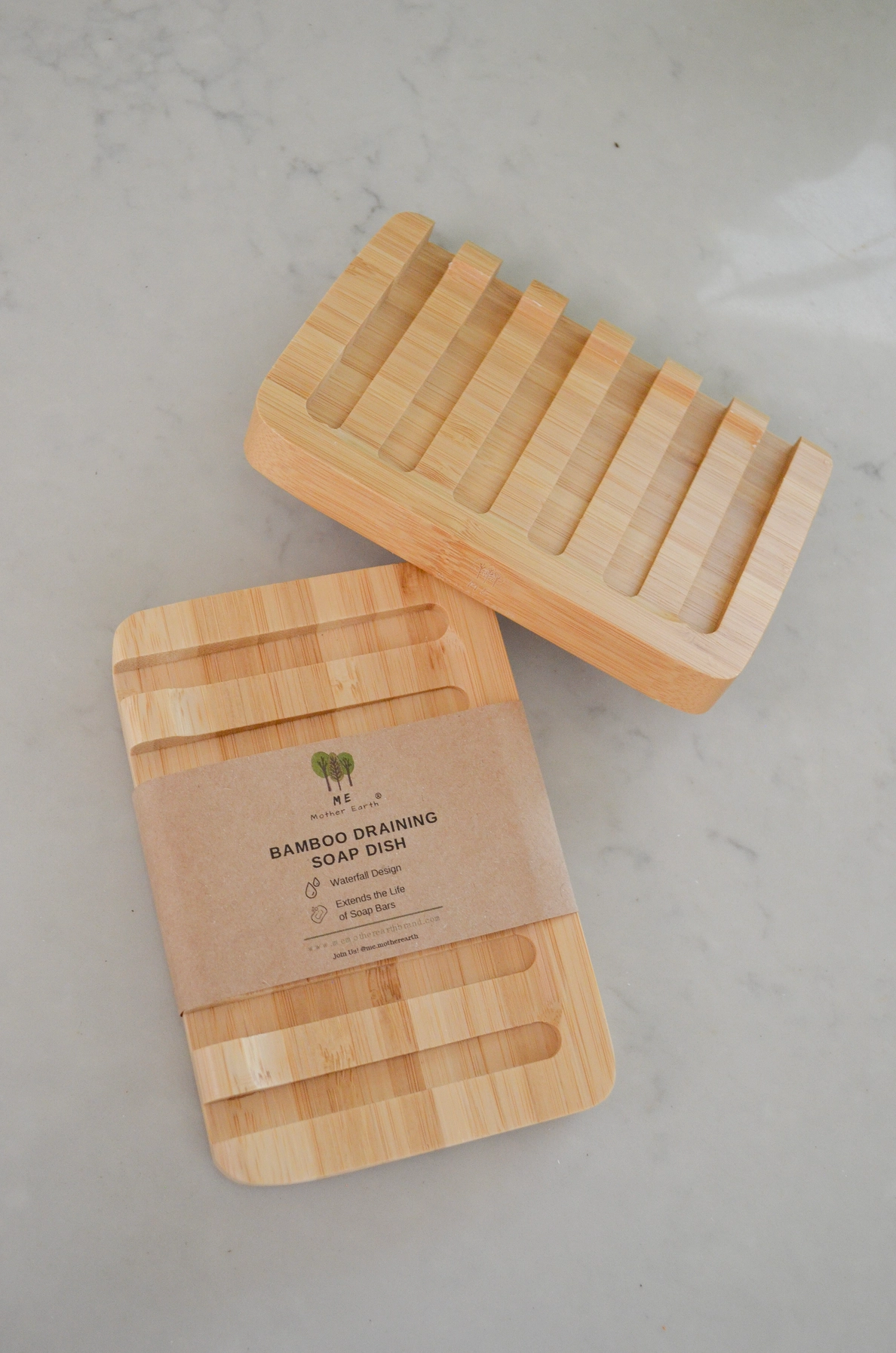 The unique self-draining, waterfall design of this bamboo soap dish directs excess water straight into the sink or shower, prolonging the life of bar soap. This versatile soap dish is suitable for use in both the kitchen and bathroom with any type of bar soap, but we love it for our dishwashing soap bars.