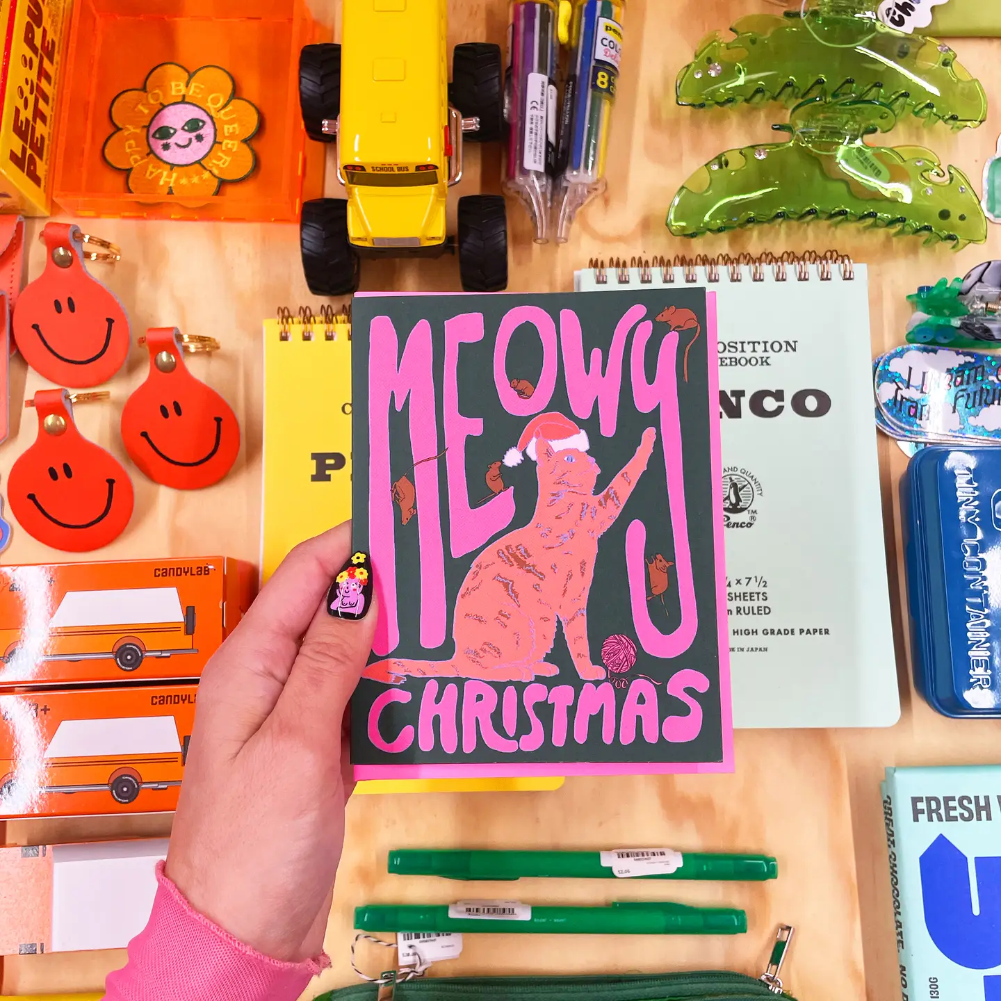 Ash + Chess is a stationery & gift company run by queer and trans couple Ashley Molesso (she/her) and Chess Needham (he/him), based out of Kingston, NY. They create greeting cards, art prints and more in bold, retro color palettes, often using their artwork to uplift the queer community.