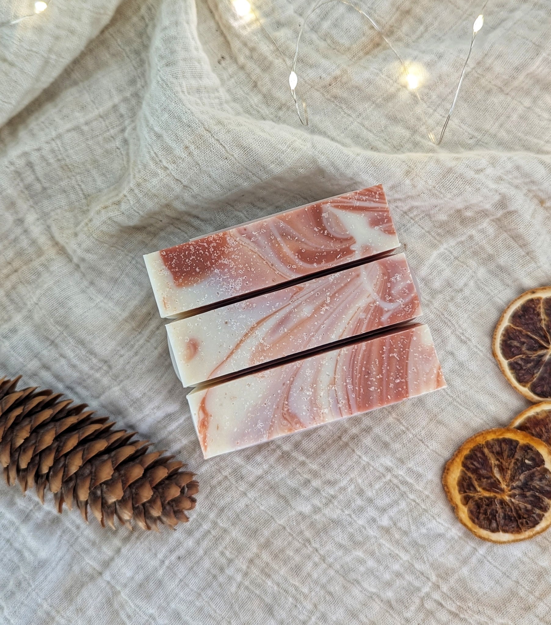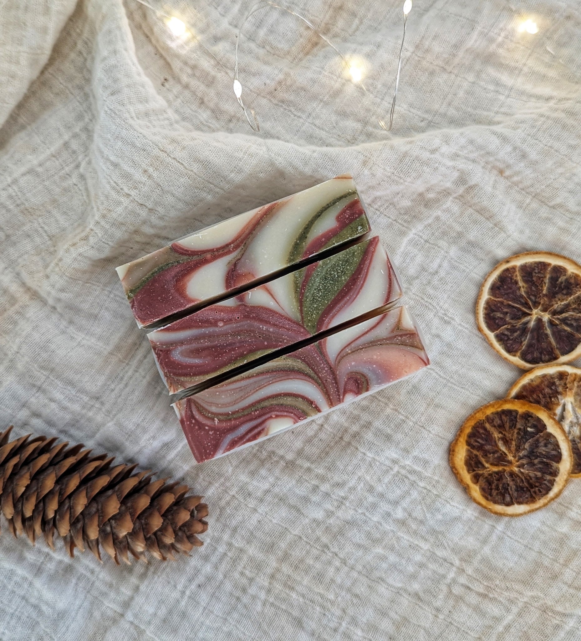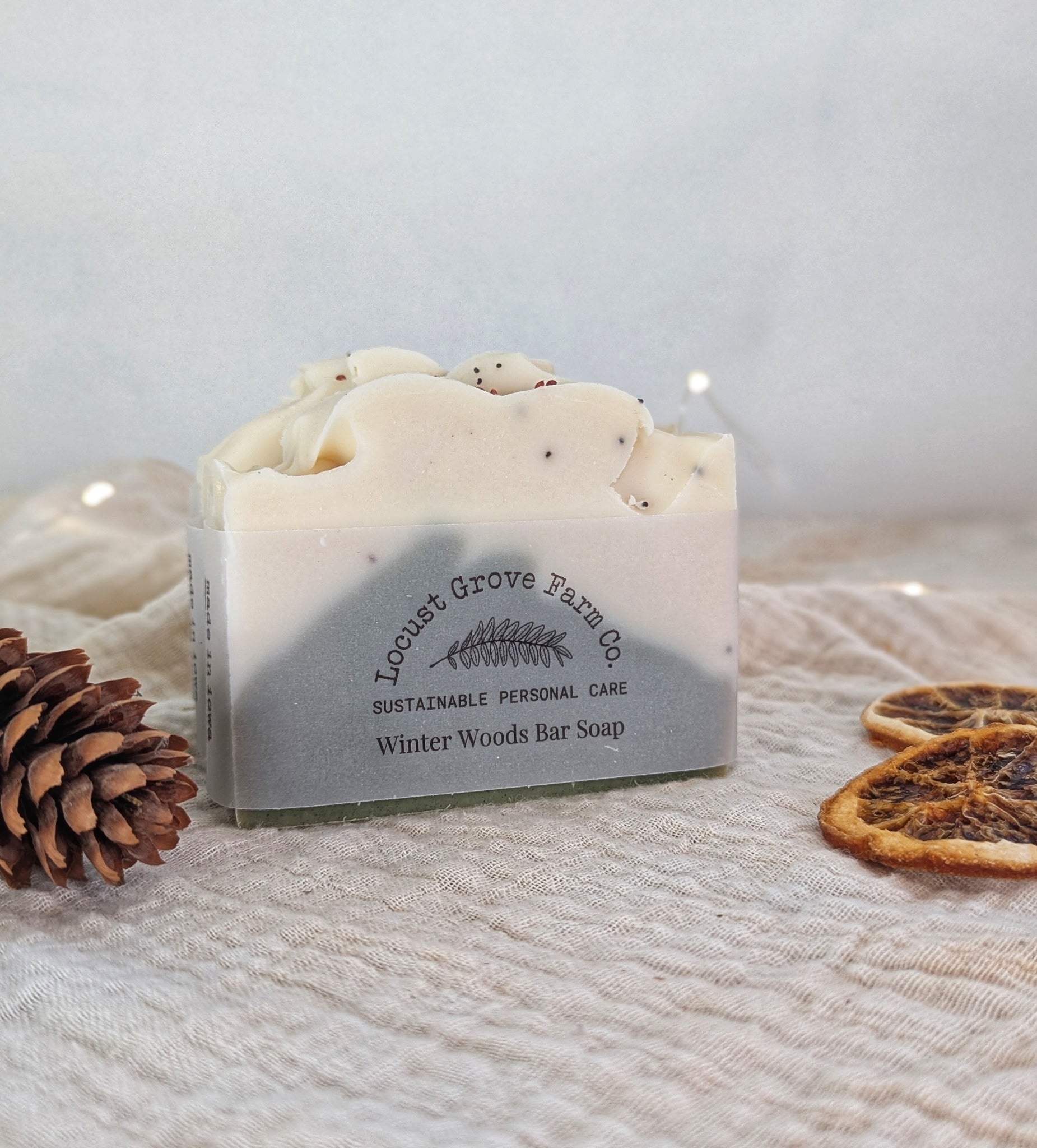 WINTER WOODS: A delightful walk in the woods without leaving your house! Siberian Fir needle and a hint of lavender creates a unisex aroma that anyone will love. Naturally colored with French green clay, spirulina and spinach powder and topped with poppy and cranberry seeds.