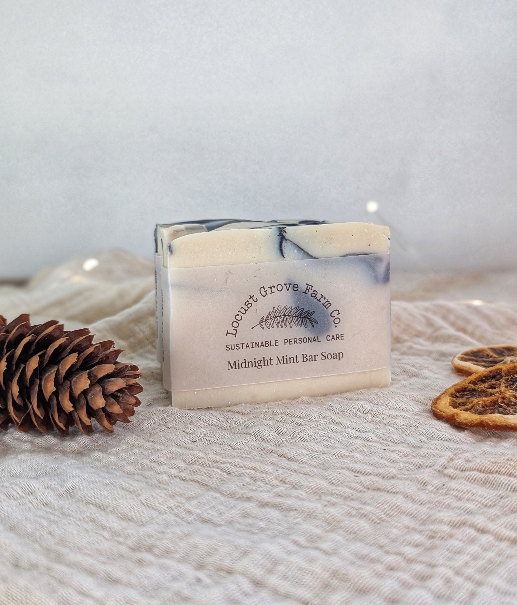 MIDNIGHT MINT: A favorite every year you ask for by name! Midnight Mint is an intense blend of peppermint, spearmint, cinnamon and more. A striking swirled look infused with kaolin clay and bamboo charcoal. Love this aroma? Check out the seasonal shampoo bar using this essential oil blend!